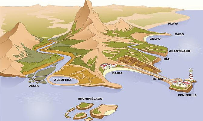 Ría: Es un accidente geomorfológico que designa una de las formas que puede tomar el valle fluvial en torno a la desembocadura de un río, cuando un valle costero queda sumergido bajo el mar por la elevación del nivel de agua. Es un brazo de mar que se interna en la costa y que está sometido a la acción de las mareas. Ej: La ría de Arosa, la mayor de las rías españolas.